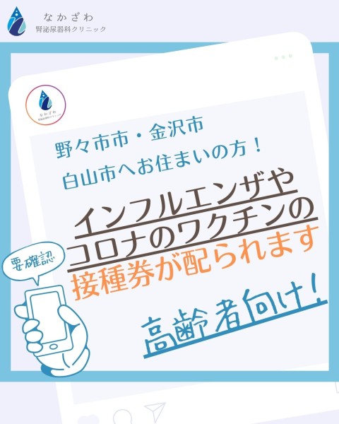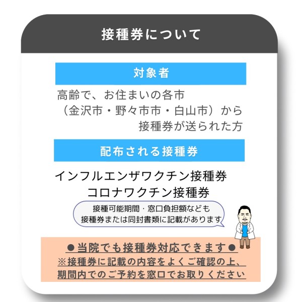 野々市市・白山市・金沢市より、各市の定めた助成対象者の方へインフルエンザワクチンやコロナワクチンの接種券が郵送されます。