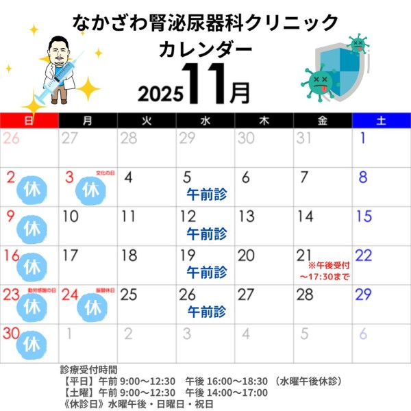 令和7年11月の診療カレンダーのご案内です。